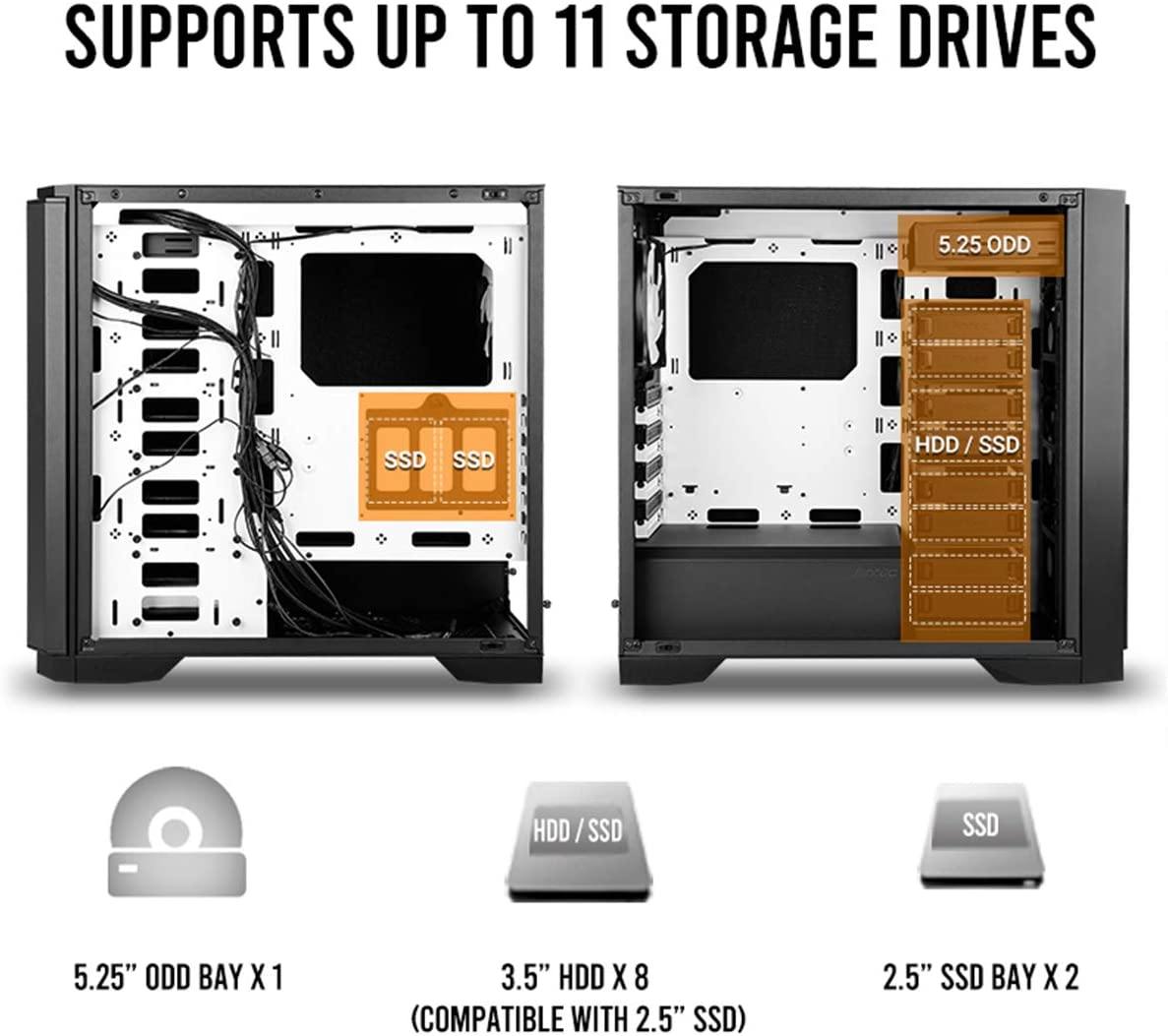 - Supports 11 drive bays with 5.25” ODD bay x 1, 3.5” HDD/2.5” SSD x 8 and dedicated 2.5” SSD x 2.