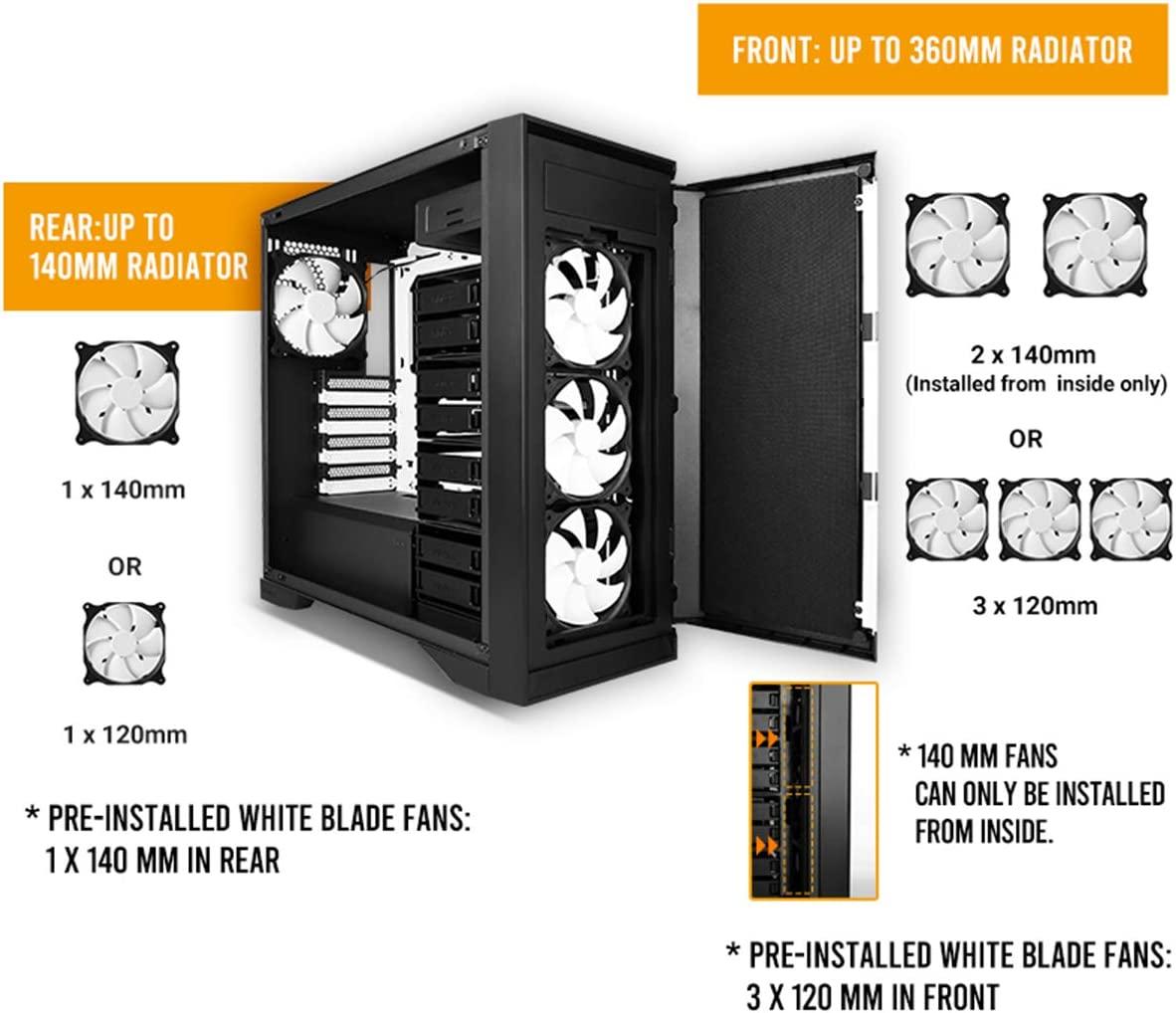 - 4 x 120/140mm cooling fans pre-installed in front and rear; up to 4 fan mounts with the maximum of 360mm radiator support for better cooling.