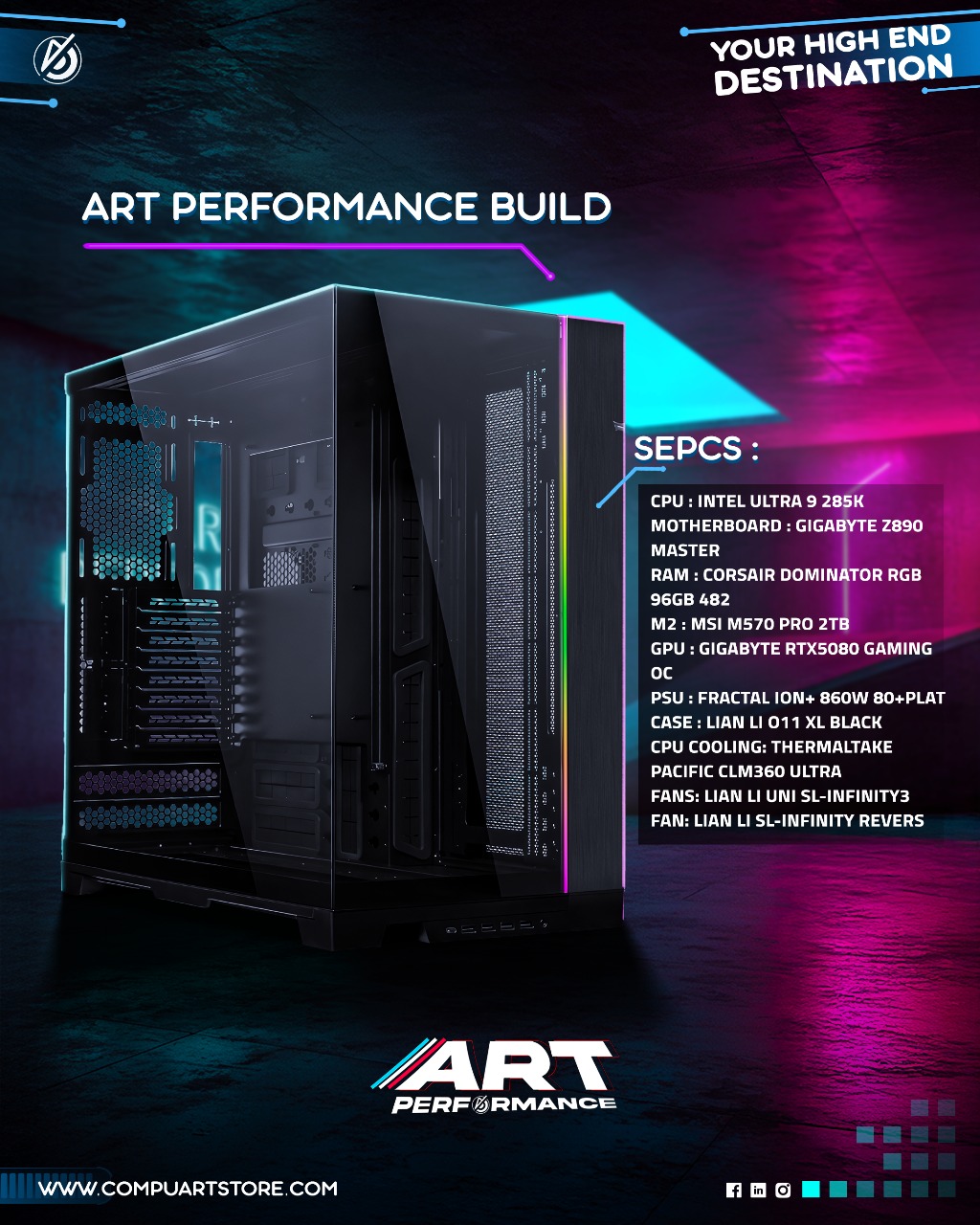 Experience ultimate computing with the ART Performance Infinity X. Powered by the Intel Core Ultra 9 285K processor, paired with a GIGABYTE Z890 AORUS Master motherboard, and 96GB Corsair Dominator RGB RAM, this build is engineered for next-gen gaming, 3D rendering, and AI workloads. The GIGABYTE RTX 5080 Gaming OC 16G delivers stunning graphics performance, perfect for 4K gaming and intensive content creation.