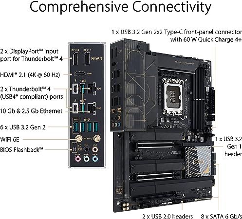 - Extensive connectivity: Dual Thunderbolt 4 Type-C ports, 10 Gb & 2.5 Gb onboard Ethernet, WiFi 6E, 4x M.2 slots and front panel USB 3.2 Gen2x2 Type-C ports with 60W fast charging support.