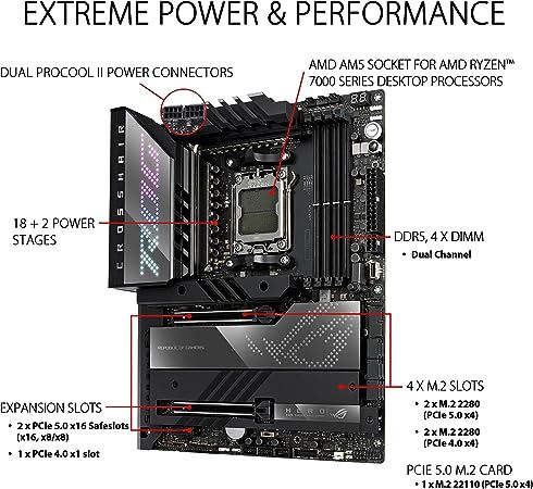 AMD Socket AM5(LGA 1718) for AMD Ryzen 7000 Series Desktop Processors.Intelligent Control: ASUS-exclusive tools including AI Cooling II and Two-Way AI Noise Cancelation for easy configuration.Robust Power Solution: 18 + 2 teamed power stages rated for 110A, ProCool II power…