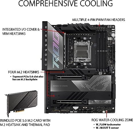 - Optimized Thermal Design: Large VRM heatsinks plus integrated aluminum I/O cover, high-conductivity thermal pad, five M.2 heatsinks and three with embedded backplates, plus the ROG Water Cooling Zone.