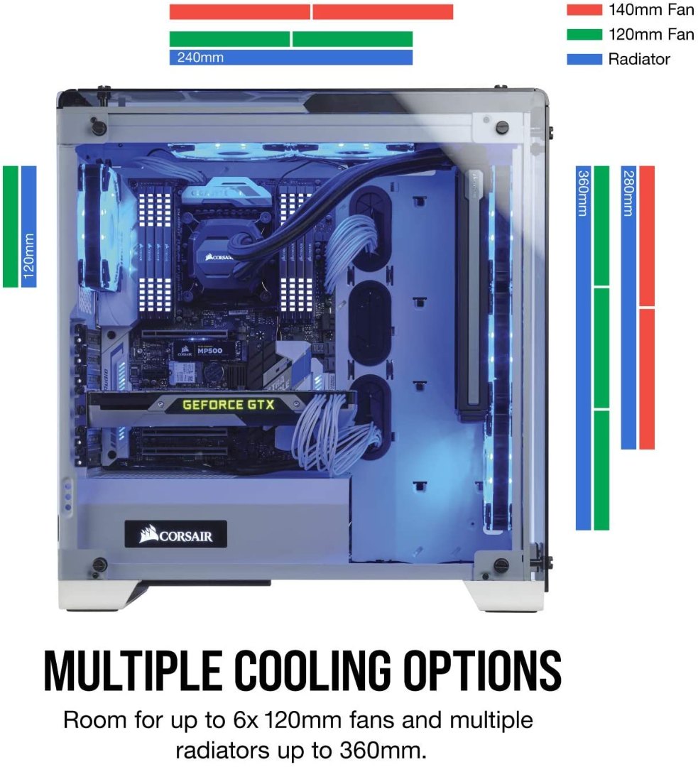 BrandCorsairColorWhiteMaterialTempered GlassCooling MethodAirMotherboard CompatabilityATXItem Weight10.9 KilogramsItem Dimensions LxWxH18.89 x 20.15 x 9.21 inchesCase TypeMidi TowerTotal USB Ports2