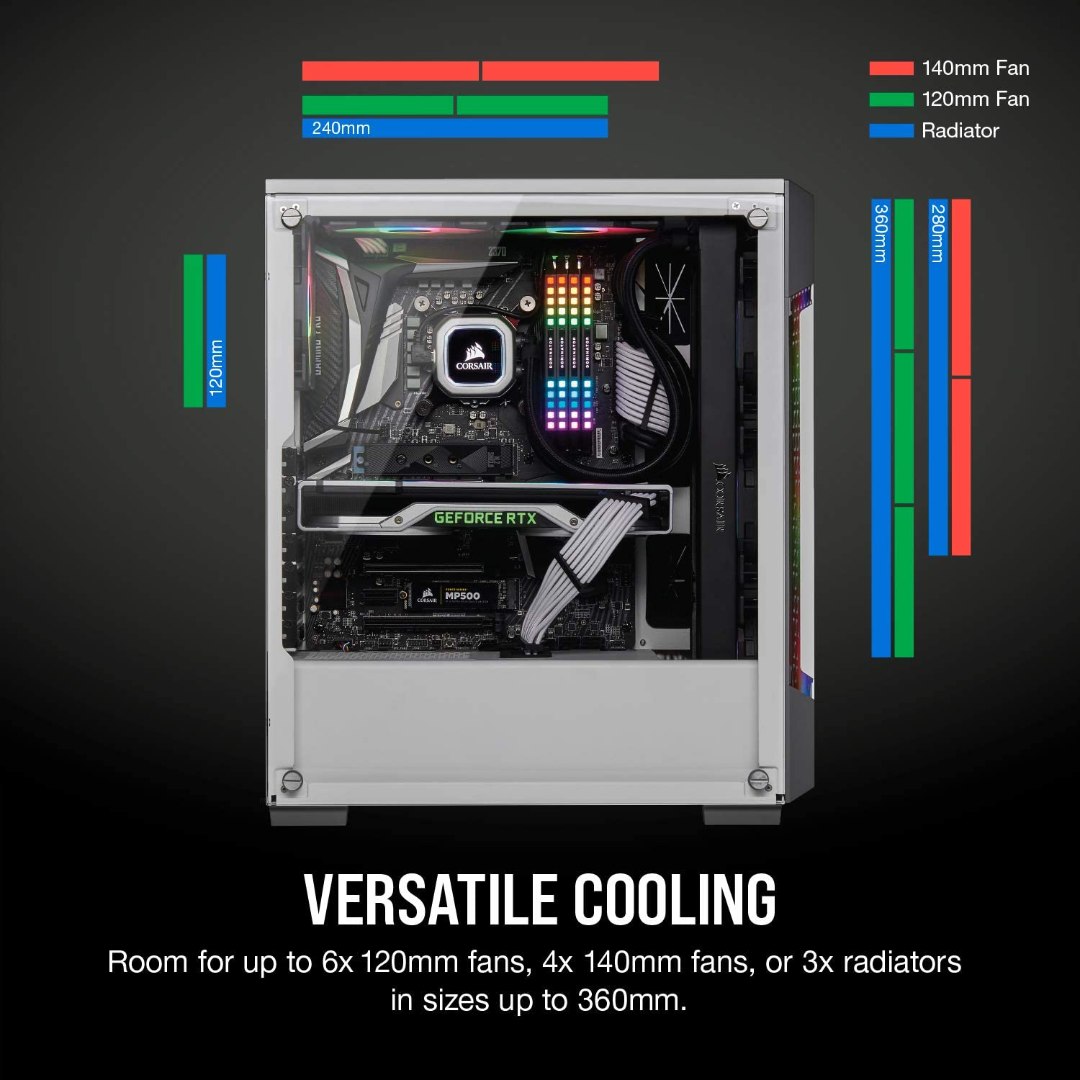 BrandCorsairColorWhiteMaterialTempered Glass, Alloy SteelCooling MethodAirMotherboard CompatabilityATXItem Weight6.5 KilogramsItem Dimensions LxWxH15.55 x 8.27 x 17.72 inchesCase TypeFull Tower