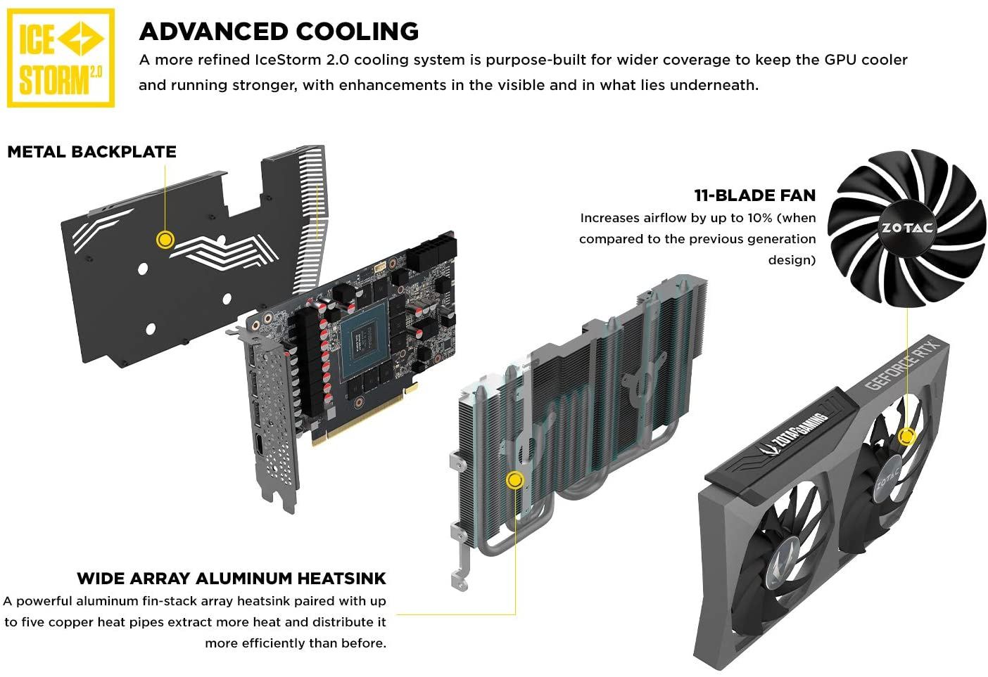 - White LED Logo Lighting, IceStorm 2.0 Advanced Cooling, Active Fan Control, Freeze Fan Stop, Metal Backplate